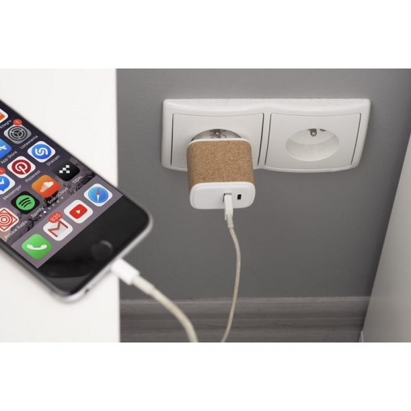 Ładowarka sieciowa BLOSETO to praktyczny gadżet umożliwiający ładowanie urządzeń mobilnych za pomocą wbudowanego portu USB-A i portu typu C. Ładowarka posiada funkcję szybkiego w standardzie QC 3.0. ładowania o mocy 20W. Wykończona jest korkiem dzięki czemu prezentuje się nietuzinkowo.