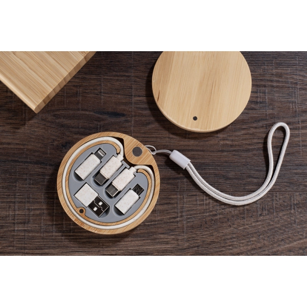 Zestaw kabli MIJATO do ładowania w stylowym okrągłym opakowaniu wykonanym z bambusa. Kable posiadają funkcje zarówno ładowania jak i przesyłu danych. Zestaw zawiera 4 typy końcówek: USB typ C, USB, micro USB oraz adapter kompatybilny z urządzeniami iOS. Wykonane są ze słomy pszenicznej.