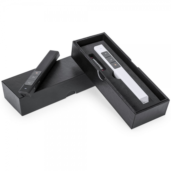 Bezprzewodowy wskaźnik laserowy 1 LED, posiada przyciski poprzedni/następny do przełączania slajdów prezentacji, odbiornik USB w komplecie, w pudełku podarunkowym