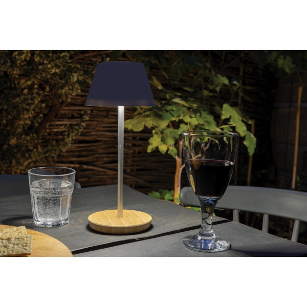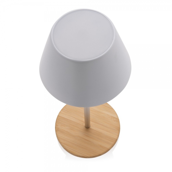 Lampka na biurko, 2 tryby świecenia, przycisk dotykowy w podstawie, wbudowany akumulator 1800 mAh pozwala na świecenie do 18 godzin na jednym ładowaniu, ponowne ładowanie w 2 godziny, wejście USB typu C do ładowania, wykonana z ABS z recyklingu z certyfikatem RCS i bambusa z certyfikatem FSC®, całkowita zawartość materiałów z recyklingu obliczona w oparciu o wagę całkowitą przedmiotu: 40%, w pudełku z papieru kraftowego z certyfikatem FSC® mix