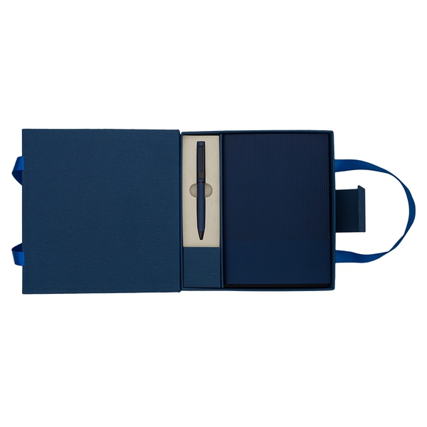 Zestaw składający się z notesu A5 (80 kartek w linie, 80 g/m2) i długopisu z niebieskim wkładem. Zestaw zapakowany w eleganckie pudełko z uchwytami.